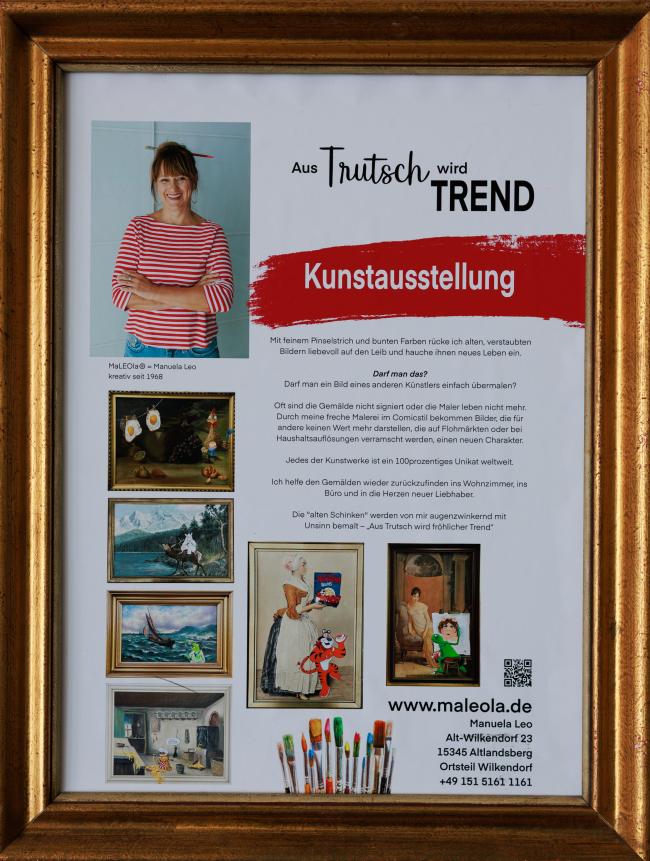 Aus Trutsch wird Trend ist das Motto unter dem Manuale Leo Flohmarktfunde, Schinken in Öl und ähnliches zu neuem Leben erweckt. Ihe kreative und außergewöhnliche Arbeit lädt zum Schmunzeln und Staunen ein. Verstaubte Gemälde und Kunstdrucke erfahren mit Comic-Farben und trockenem Humor eine verblüffende Wiedergeburt.